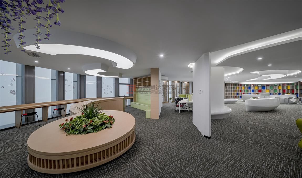 辦公室裝修公司案例:整體辦公空間設(shè)計(jì)中,大氣與細(xì)致并存,將設(shè)計(jì)與藝術(shù)結(jié)合。設(shè)計(jì)理念: 室內(nèi)設(shè)計(jì)元素均交織凝聚于行云流水的曲線(xiàn)流動(dòng)空間,設(shè)計(jì)表現(xiàn)形式不受拘束,每個(gè)空間都有自己特殊的弧度,致力于搭建“創(chuàng)新+智能+生態(tài)”的辦公環(huán)境。
